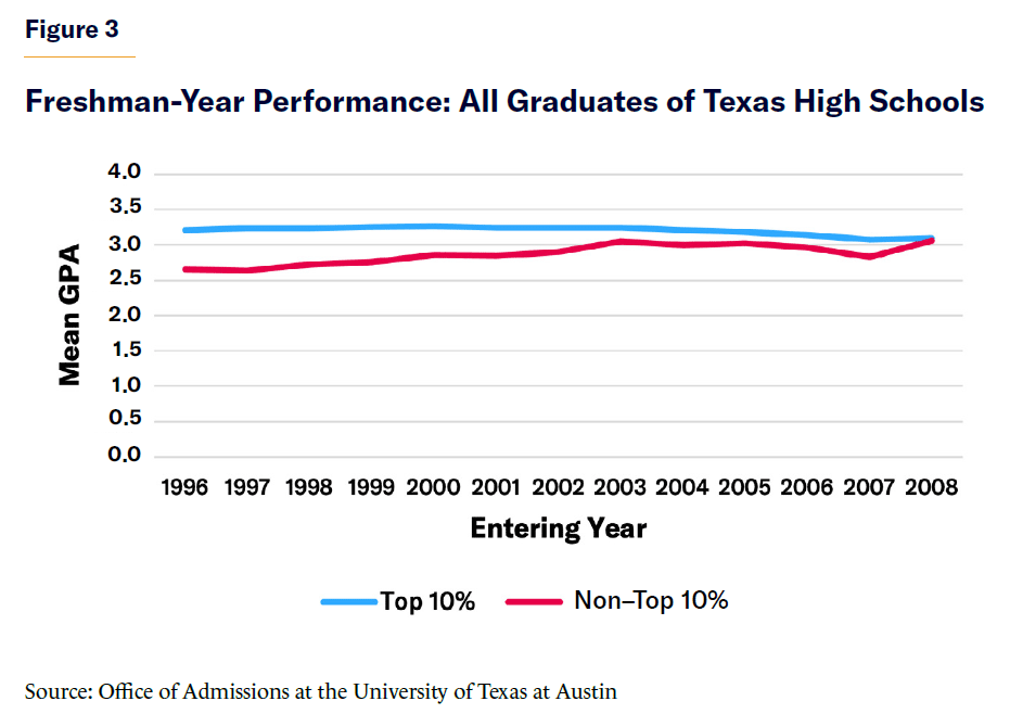 It is contested, however, whether percent plans in their current form do provide underrepresented minorities and disadvantaged students with greater access to the flagship campuses of state university systems. Moreover, while Texas’s top 10% law was justified, at least in part, on the grounds that top 10% enrollees would academically outperform their non–top 10% counterparts, UT’s own descriptive data between 1996 and 2008 suggest that this may no longer be the case.