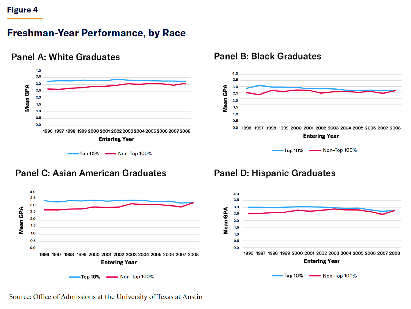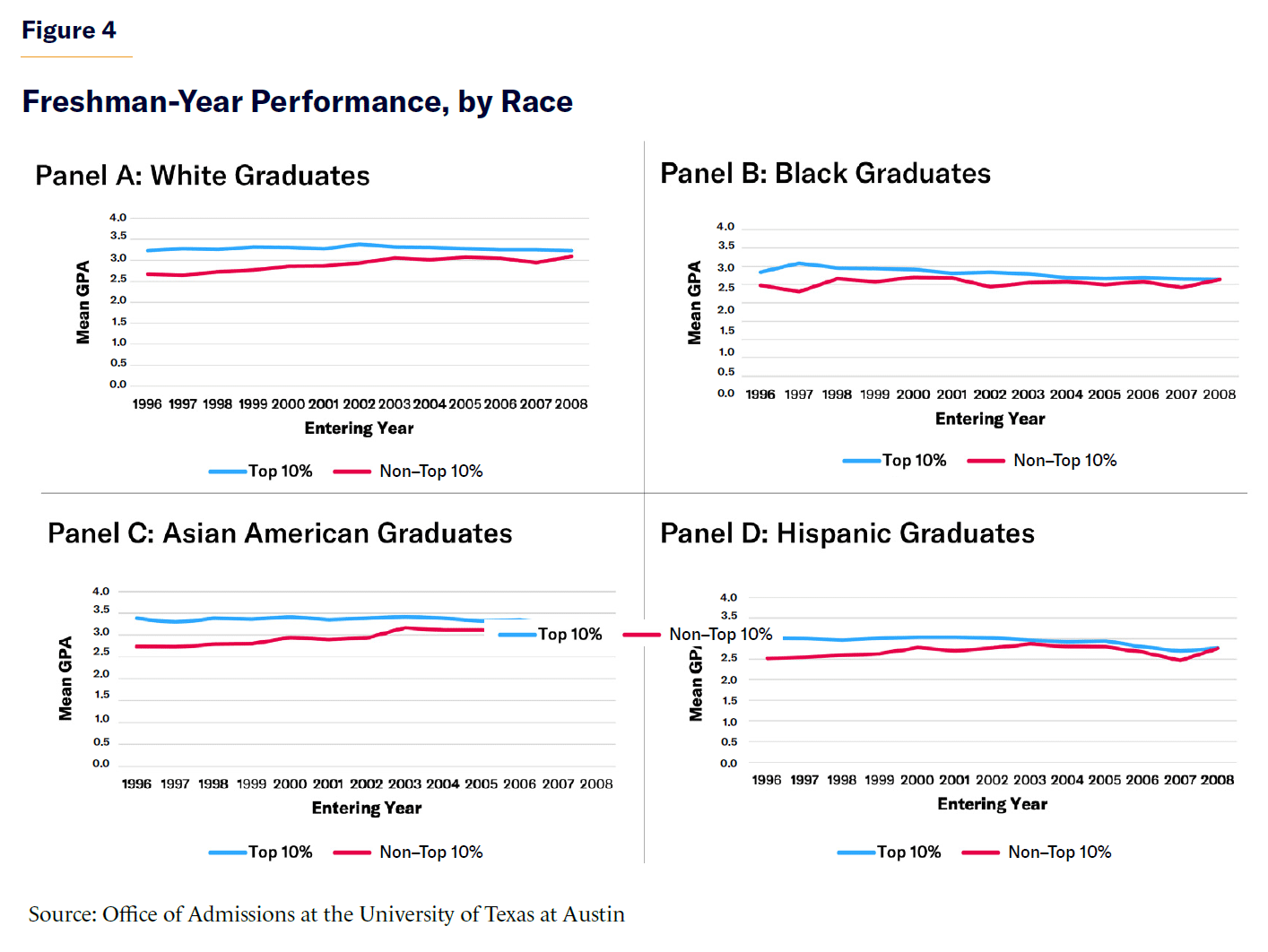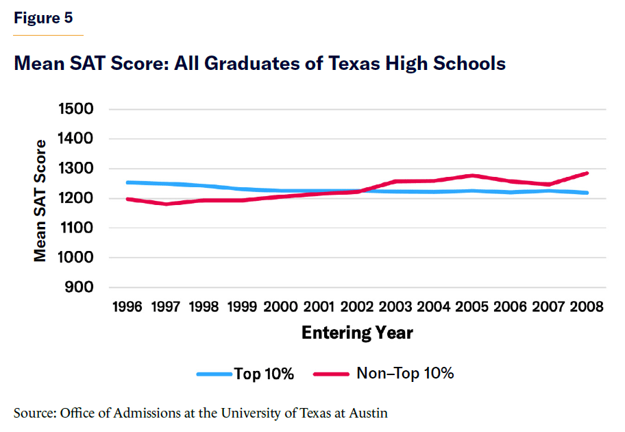 - The consequences of Texas’s percent plan for academic performance at UT and Texas A&M are mixed. Top 10% enrollees do not seem to outperform non–top 10% enrollees by leaps and bounds, as has often been assumed. However, top 10% enrollees do not lag behind, either. Descriptive data shared by UT’s admissions office show that while top 10% enrollees initially had higher freshman-year GPAs, on average, than non–top 10% enrollees, their performances converged after a few years. And while top 10% enrollees at first possessed higher SAT scores than non–top 10% enrollees, this eventually flipped.