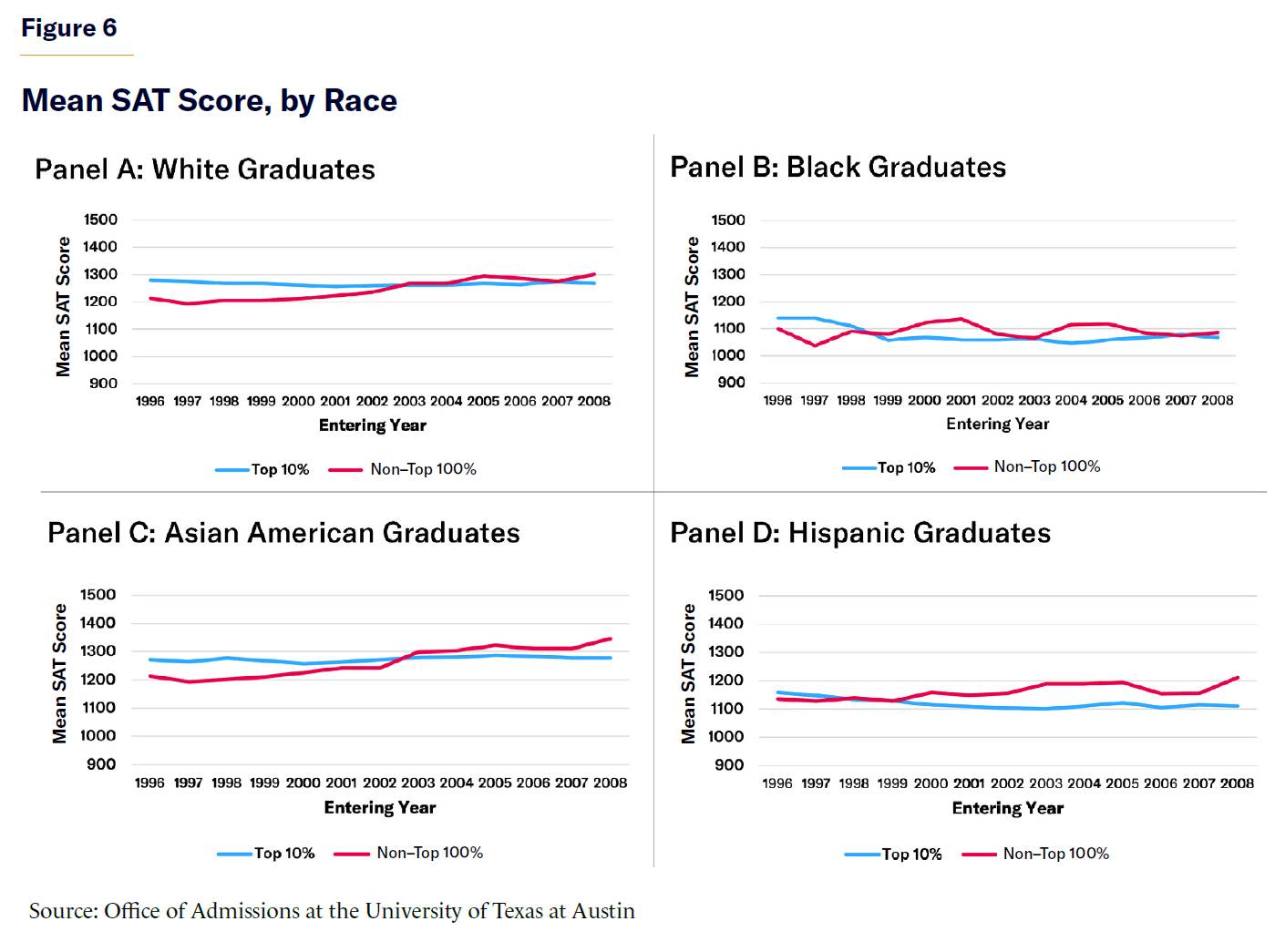 The UT data also report mean SAT scores by racial/ethnic group for Texas students entering the flagship between 1996 and 2008. Figures 5 and 6 plot the mean SAT scores of top 10% enrollees against the mean SAT scores of non–top 10% enrollees by racial group.