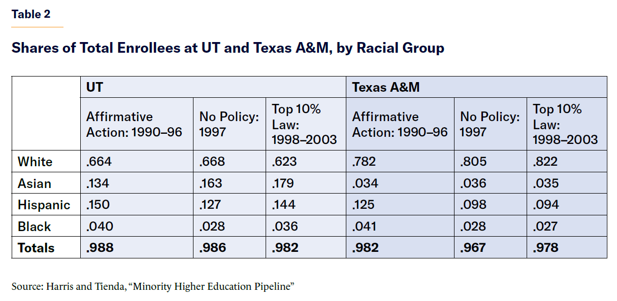 - Texas’s top 10% law did increase black and Hispanic enrollment at the state flagships, but it did not fully restore black and Hispanic enrollment lost at these campuses following Hopwood v. Texas,[2] a 1996 Fifth Circuit decision that banned affirmative action in the state. Similarly, while the percent plan did increase access to UT and Texas A&M among disadvantaged high schoolers, the extent of this increase is contested in social science research.